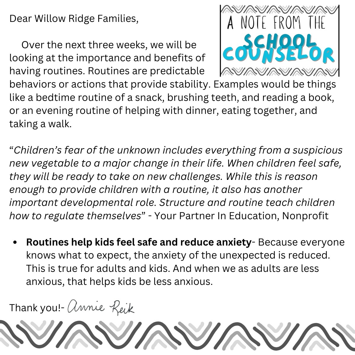 Just a friendly reminder that we provide only one conference per child during conferences. If the parents of a student are not together, please take it upon yourselves to coordinate an amicable time for conferences. Any doubling of conferences on the online sign-up will result in one of the appointments being cancelled to make room for other parents. Thank you for your cooperation. The conference dates are Tuesday, November 11th and Thursday, November 13th from 5:00 - 8:00 pm at Willow Ridge. On Friday, November 14th, conferences will be from 1:00 pm -3:00 pm virtually.