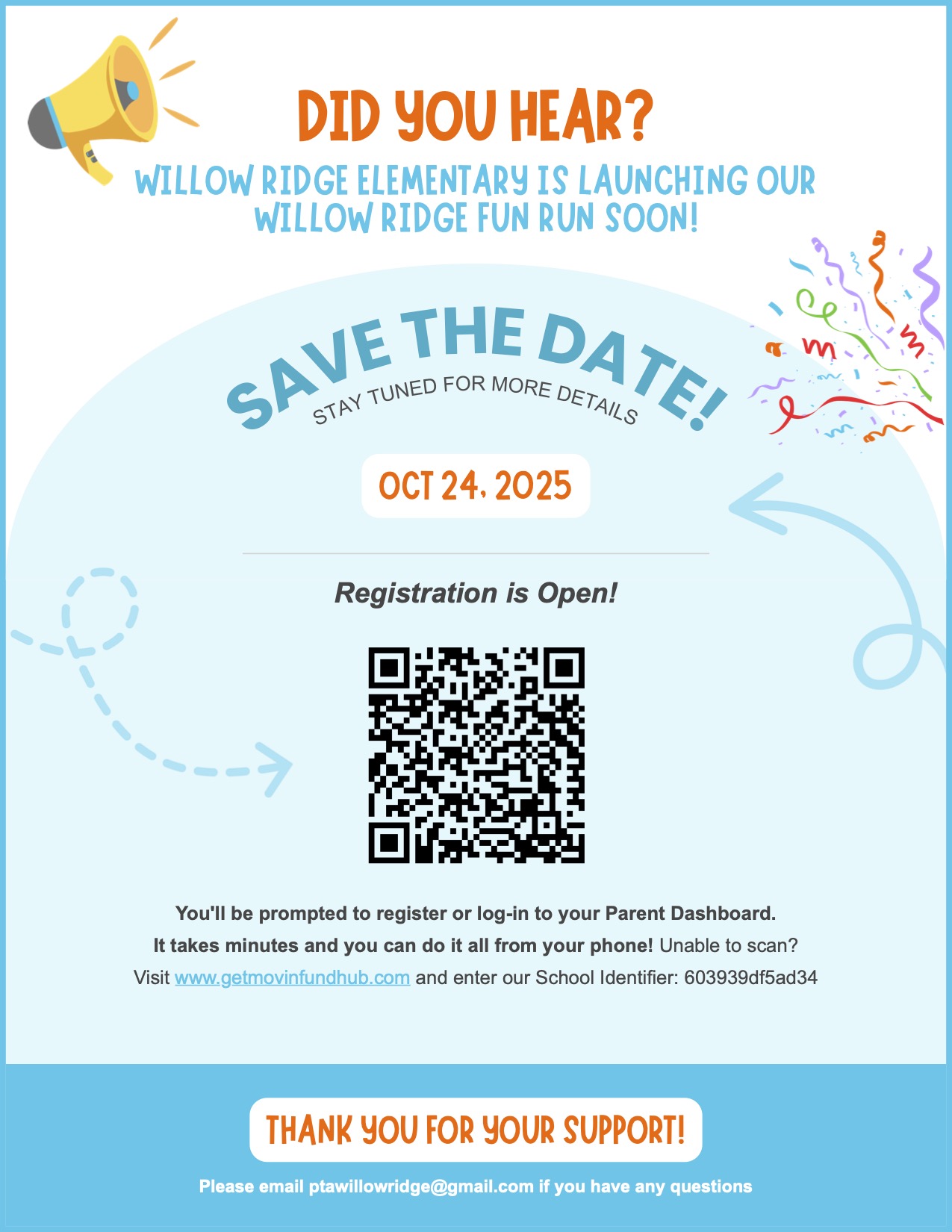 We’re excited to kick off our Fun Run campaign this Monday! Willow Ridge is raising money to support our amazing PTA, which helps make our school the best it can be!