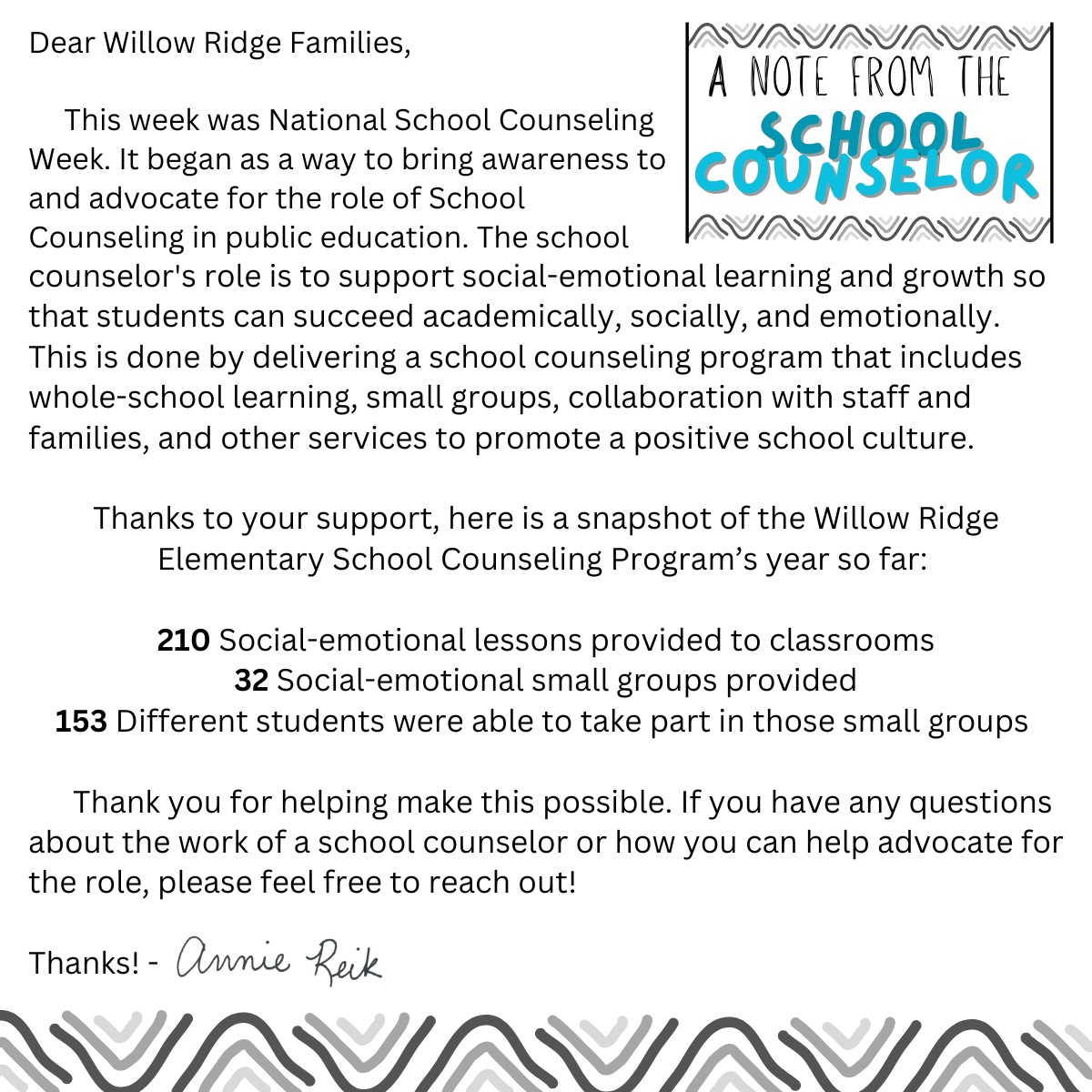 This week was School Counselors Appreciation Week. Ms. Reik does a wonderful job as our school counselor and brings compassion, strong listening skills, and a steady guidance to every student who walks through our doors. She creates a safe, inclusive space where students feel seen, supported, and empowered to succeed academically and socially. We are so very grateful for Annie's commitment to helping our school community thrive!