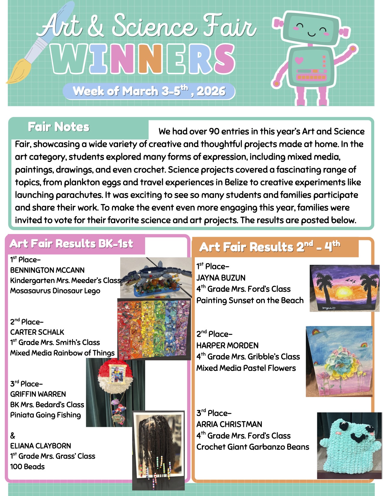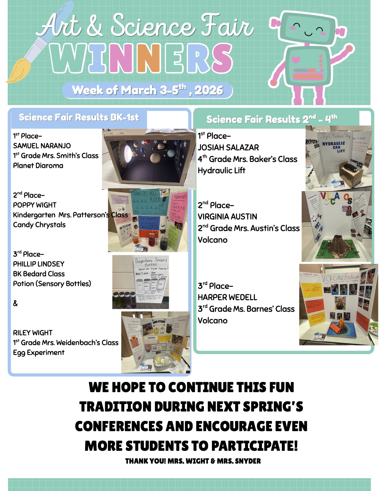 The Art & Science Fair was amazing! There were so many fabulous projects made by our students on display during both conference nights. Thank you to Mrs. Snyder and Mrs. Wight for creating this opportunity for students to showcase their talents and hard work.