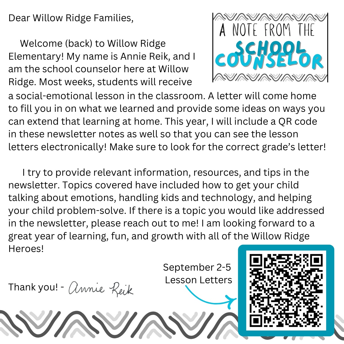 Welcome to the 2025-2026 school year! We had a great first week of the school year and the staff are diligently working to establish a relationship with your children. My door is always open and I welcome the opportunity to build school and community relationships with the families of Willow Ridge.
