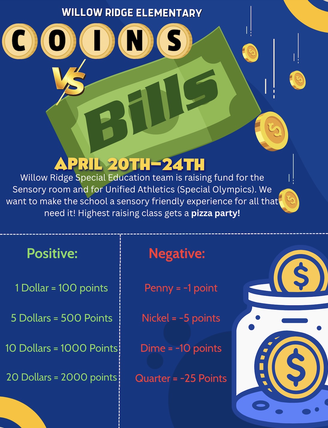 This year, Willow Ridge Unified is holding a penny war called Bills VS. Coins from April 20th-24th. The class who has the highest total points at the end of the fundraiser will get a pizza party!