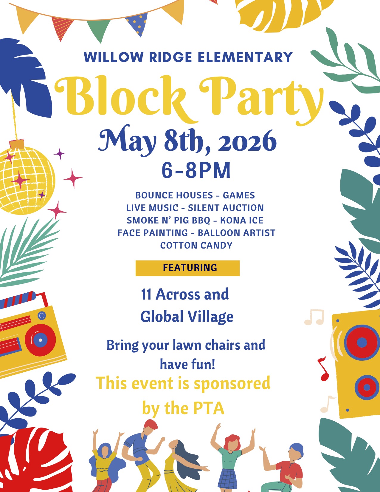 We are excited to invite all Willow Ridge families to our upcoming Block Party on Friday, May 8th from 6:00–8:00 PM! This special evening is a great opportunity to come together as a community and enjoy a night filled with food, music, games, and fun for all ages.